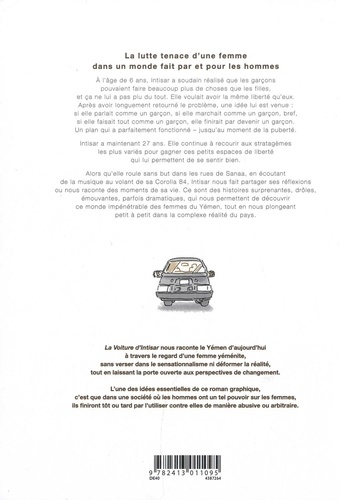 La lutte tenace d'une femme dans un monde fait par et pour les hommes. A l'âge de 6 ans, Intisar a soudain réalisé que les garçons pouvaient faire beaucoup plus de choses que les filles, et ça ne lui a pas plu du tout. Elle voulait avoir la même liberté qu'eux. Après avoir longuement retourné le problème, une idée lui est venue : si elle parlait comme un garçon, si elle marchait comme un garçon, bref, si elle faisait tout comme un garçon, elle finirait par devenir un garçon. Un plan qui a parfaitement fonctionné - jusqu'au moment de la puberté. Intisar a maintenant 27 ans. Elle continue à recourir aux stratagèmes les plus variés pour gagner ces petits espaces de liberté qui lui permettent de se sentir bien. Alors qu'elle roule sans but dans les rues de Sanaa, en écoutant de la musique au volant de sa Corolla 84, Intisar nous fait partager ses réflexions ou nous raconte des moments de sa vie. Ce sont des histoires surprenantes, drôles, émouvantes, parfois dramatiques, qui nous permettent de découvrir ce monde impénétrable des femmes du Yémen, tout en nous plongeant petit à petit dans la complexe réalité du pays.