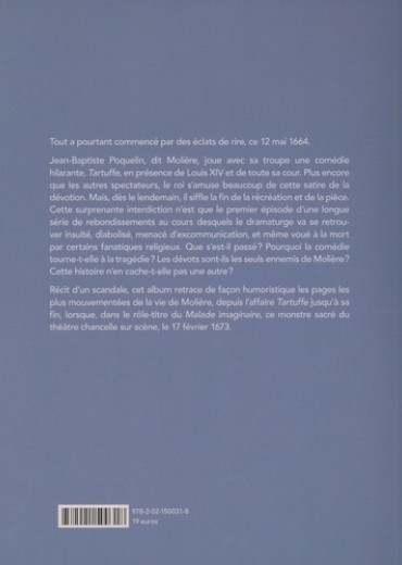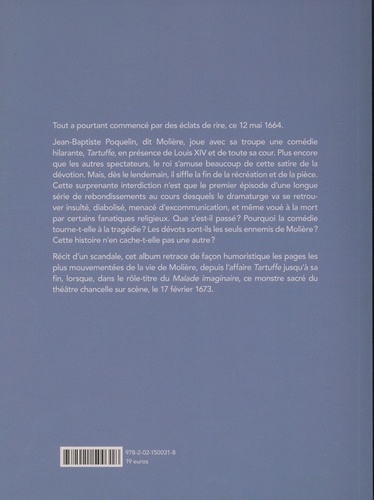 Tout a pourtant commencé par des éclats de rire, ce 12 mai 1664. Jean-Baptiste Poquelin, dit Molière, joue avec sa troupe une comédie hilarante, Tartuffe, en présence de Louis XIV et de toute sa cour. Plus encore que les autres spectateurs, le roi s'amuse beaucoup de cette satire de la dévotion. Mais, dès le lendemain, il siffle la fin de la récréation et de la pièce. Cette surprenante interdiction n'est que le premier épisode d'une longue série de rebondissements au cours desquels le dramaturge va se retrouver insulté, diabolisé, menacé d'excommunication, et même voué à la mort par certains fanatiques religieux. Que s'est-il passé? Pourquoi la comédie tourne-t-elle à la tragédie ? Les dévots sont-ils les seuls ennemis de Molière ? Cette histoire n'en cache-t-elle pas une autre ? Récit d'un scandale, cet album retrace de façon humoristique les pages les plus mouvementées de la vie de Molière, depuis l'affaire Tartuffe jusqu'à sa fin, lorsque, dans le rôle-titre du Malade imaginaire, ce monstre sacré du théâtre chancelle sur scène, le 17 février 1673.