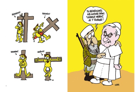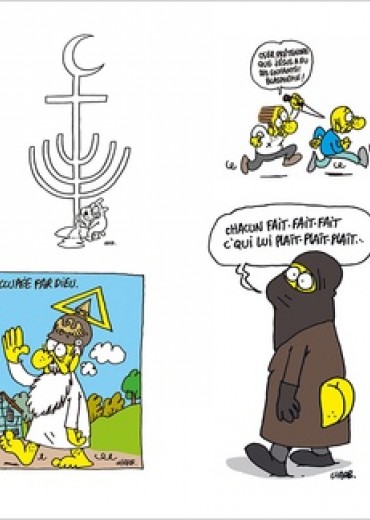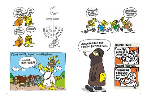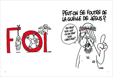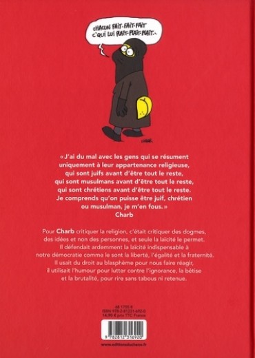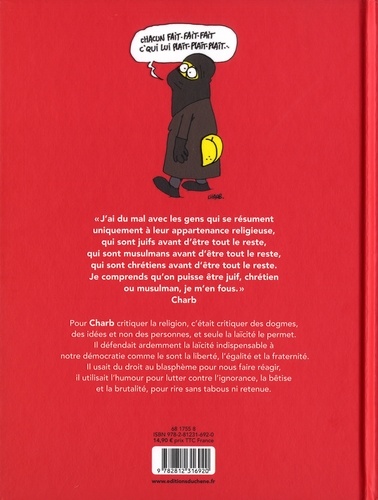 "J'ai du mal avec les gens qui se résument uniquement à leur appartenance religieuse, qui sont juifs avant d'être tout le reste, qui sont musulmans avant d'être tout le reste, qui sont chrétiens avant d'être tout le reste. Je comprends qu'on puisse être juif, chrétien ou musulman, je m'en fous." Charb Pour Charb critiquer la religion, c'était critiquer des dogmes, des idées et non des personnes, et seule la laïcité le permet. Il défendait ardemment la laïcité indispensable à notre démocratie comme le sont la liberté, l'égalité et la fraternité. Il usait du droit au blasphème pour nous faire réagir, il utilisait l'humour pour lutter contre l'ignorance, la bêtise et la brutalité, pour rire sans tabous ni retenue.