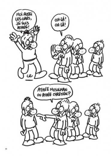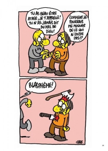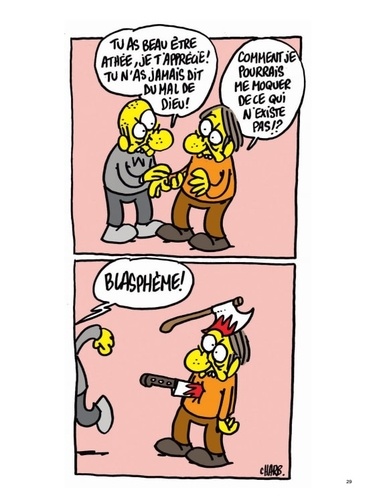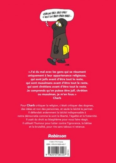 "J'ai du mal avec les gens qui se résument uniquement à leur appartenance religieuse, qui sont juifs avant d'être tout le reste, qui sont musulmans avant d'être tout le reste, qui sont chrétiens avant d'être tout le reste. Je comprends qu'on puisse être juif, chrétien ou musulman, je m'en fous". Charb Pour Charb critiquer la religion, c'était critiquer des dogmes, des idées et non des personnes, et seule la laïcité le permet. Il défendait ardemment la laïcité indispensable à notre démocratie comme le sont la liberté, l'égalité et la fraternité. Il usait du droit au blasphème pour nous faire réagir, il utilisait l'humour pour lutter contre l'ignorance, la bêtise et la brutalité, pour rire sans tabous ni retenue.