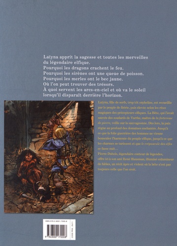 Laïyna apprit la sagesse et toutes les merveilles du légendaire elfique. Pourquoi les dragons crachent le feu. Pourquoi les sirènes ont une queue de poisson. Pourquoi les merles ont le bec jaune. Où l'on peut trouver des trésors. A quoi servent les arcs-en-ciel et où va le soleil lorsqu'il disparaît derrière l'horizon. Laïyna, fille de serfs, trop tôt orpheline, est recueillie par le peuple de féérie, puis élevée selon les rites magiques des précepteurs elfiques. La Bête, qui l'avait sauvée des soudards de Vurthe, maître de la forteresse de pierre, veille sur la sauvageonne. Dès lors, la paix règne au profond des domaines enchantés. Jusqu'à ce que la folie guerrière des hommes ne vienne bousculer l'harmonie du peuple elfique, jusqu'à ce que les charmes se tarissent et que le crépuscule des elfes se fasse nuit... Pierre Dubois, légendaire conteur de légendes, offre ici à son ami René Hausman, illuminé enlumineur de fables, un récit âpre et violent où la bête n'est pas toujours celle que l'on croit.