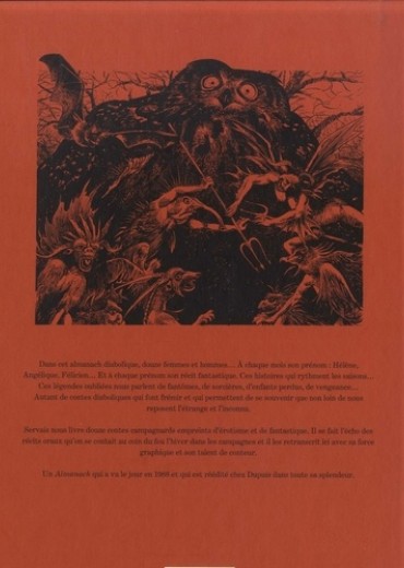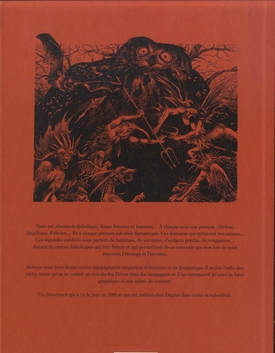 Dans cet almanach diabolique, douze femmes et hommes... A chaque mois son prénom : Hélène, Angélique, Félicien... Et à chaque prénom son récit fantastique. Ces histoires qui rythment les saisons.. Ces légendes oubliées nous parlent de fantômes, de sorcières, d'enfants perdus, de vengeance... Autant de contes diaboliques qui font frémir et qui permettent de se souvenir que non loin de nous reposent l'étrange et l'inconnu. Servais nous livre douze contes campagnards empreints d'érotisme et de fantastique. il se fait l'écho des récits oraux qu'on se contait au coin du feu l'hiver dans les campagnes et il les retranscrit ici avec sa force graphique et son talent de conteur. Un Almanach qui a vu le jour en 1988 et qui est réédité chez Dupais dans foute sa splendeur.