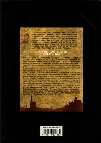 Par le traité de Francfort, en 1871, la France a cédé à l'Allemagne l'Alsace (sauf ce qui deviendra le territoire de Belfort) et une partie de la lorraine. Sous le nom de "Reichsland Elsass-Lothringen", celles-ci deviennent, en quelque sorte, propriété de l'ensemble des états membres de l'Empire allemand. L'exode des "optants", qui quittent l'alsace pour garder la nationalité française, et l'arrivée massive de "Vieux-Allemands, amènent des changements dans la société. Avec le temps, les voix de la protestation se font plus rares tandis qu'émergent des mouvements "autonomistes", avec des points de vue varies quant à la nature de l'autonomie qu'ils souhaitent. Cette période - presque un demi-siècle - est marquée par une vie artistique et littéraire animée, notamment avec le groupe de Saint-Léonard, autour de Charles Spindler. Dans le domaine économique, de nouvelles activités industrielles se font jour. Dès août 1914 se déroulent des combats violents (Linge, Hartmannswillerkopf, Tête des Faux, etc.). En novembre 1918, la république est déclarée, les "conseils d'ouvriers et de soldats" créent une ambiance révolutionnaire dans les villes. L'entrée des troupes françaises met fin à l'anarchie. A Strasbourg, Poincaré proclame le retour de l'Alsace à la France.