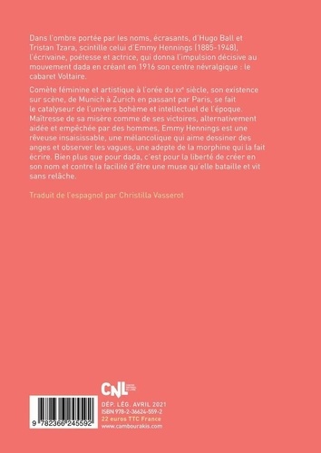 Dans l'ombre portée par les noms, écrasants, d'Hugo Ball et Tristan Tzara, scintille celui d'Emmy Hennings (1885-1948), l'écrivaine, poétesse et actrice, qui donna l'impulsion décisive au mouvement dada en créant en 1916 son centre névralgique : le cabaret Voltaire. Comète féminine et artistique à l'orée du XXe siècle, son existence sur scène, de Munich à Zurich en passant par Paris, se fait le catalyseur de [univers bohème et intellectuel de l'époque. Maîtresse de sa misère comme de ses victoires, alternativement aidée et empêchée par des hommes, Emmy Hennings est une rêveuse insaisissable, une mélancolique qui aime dessiner des anges et observer les vagues, une adepte de la morphine qui la fait écrire. Bien plus que pour dada, c'est pour la liberté de créer en son nom et contre la facilité d'être une muse qu'elle bataille et vit sans relâche.