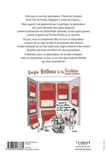 C'est quoi la vie d'un dessinateur ? Observer, écouter, sentir l'air du temps, dialoguer à coups de crayons... Mais, quand il est passionné par la politique, le dessinateur doit aussi affronter des sujets explosifs, comme la dissolution de l'Assemblée nationale, et des sujets graves, comme la guerre au Proche-Orient ou en Ukraine. Et puis, vous le constaterez dans ce livre, le dessinateur a besoin de se vider la tête et de proposer des dessins un peu loufoques ou sur des sujets plus légers comme le bel instant de grâce que nous ont offert les Jeux olympiques. Finalement, pour un dessinateur, les années changent, mais se ressemblent un peu, et ce n'est pas le peintre Rothko qui nous contredirait !