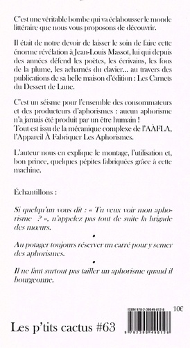 C'est une véritable bombe qui va éclabousser le monde littéraire que nous vous proposons de découvrir. Il était de notre devoir de laisser le soin de faire cette énorme révélation à jean-Louis Massot, lui qui depuis des armées défend les poètes, les écrivains, les fous de la plume, les acharnés du clavier... au travers des publications de sa belle maison d'édition : Les Carnets du Dessert de Lune. C'est un séisme pour l'ensemble des consommateurs et des producteurs d'aphorismes : aucun aphorisme n'a jamais été produit par un être humain ! Tout est issu de la mécanique complexe de l'AAFLA, l'Appareil A Fabriquer Les Aphorismes. L'auteur nous en explique le montage, l'utilisation et, bon prince, quelques pépites fabriquées grâce à cette machine.