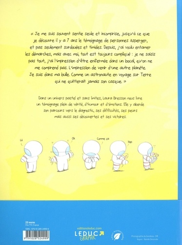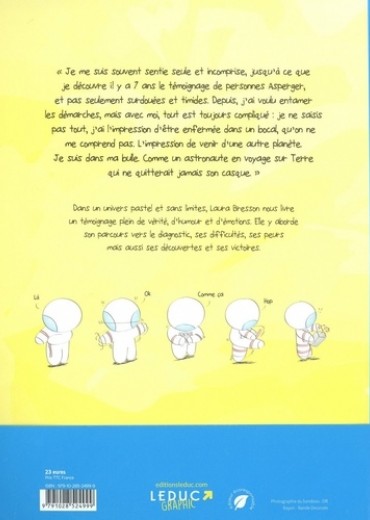 "Je me suis souvent sentie seule et incomprise, jusqu'à ce que je découvre i l y a 7 ans le témoignage de personnes Asperger, et pas seulement surdouées et timides. Depuis, j'ai voulu entamer les démarches, mais avec moi, tout est toujours compliqué : je ne saisis pas tout, j'ai l'impression d'être enfermée dans un bocal, qu'on ne me comprend pas. L'impression de venir d'une autre planète. Je suis dans ma bulle. Comme un astronaute en voyage sur Terre qui ne quitterait jamais son casque". Dans un univers pastel et sans limites, Laura Bresson nous livre un témoignage plein de vérité, d'humour et d , émotions. Elle y aborde son parcours vers le diagnostic, ses difficultés, ses peurs mais aussi ses découvertes et ses victoires. Laura Bresson est une jeune illustratrice de 32 ans. Autiste Asperger, sa trajectoire a été semée d'embûches, mais elle n'a jamais baissé les bras. Curieuse et créative, elle s'épanouit dans la photographie, les voyages, les sciences, le cinéma et mille autres centres d'intérêt. Elle souhaite partager son parcours, les réflexions et démarches qui l'ont conduite à poser un mot sur sa différence, et les changements qui en ont découlé. Elle nous propose un ticket pour entrer dans son drôle d , univers : romantique, poétique, un peu atypique.