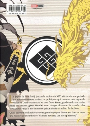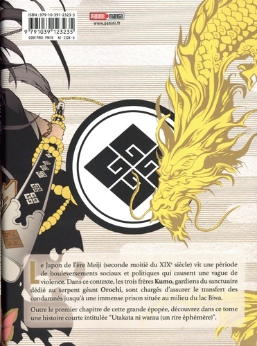 Le Japon de l'ère Meiji (seconde moitié du XIXe siècle) vit une période de bouleversements sociaux et politiques qui causent une vague de violence. Dans ce contexte, les trois frères Kumo, gardiens du sanctuaire dédié au serpent géant Orochi, sont chargés d'assurer le transfert des condamnés jusqu'à une immense prison située au milieu du lac Biwa. Outre le premier chapitre de cette grande épopée, découvrez dans ce tome une histoire courte intitulée "Utakata ni warau (un rire éphémère)".