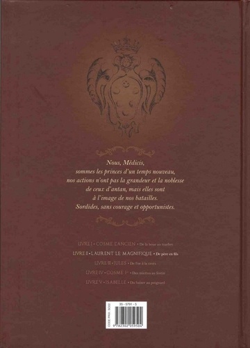 Une fresque violente et passionnée, mêlant histoire de l'art, guerre et complot, amitiés, amour et trahison. Oubliez les livres d'histoire, écoutez la voix de Florence, revivez l'épopée de ceux qui l'ont écrite... la saga des Médicis. Trop jeune, fier et belliqueux lors de son début de règne, les premières années de Laurent sont marquées par le sang et le conduisent jusqu'à une guerre ouverte avec le Pape. Lorsqu'il comprend qu'il risque de précipiter Florence vers la ruine, Laurent tente le tout pour le tout afin de sortir d'une situation inextricable. Il réalise alors qu'il doit ruser et agir comme son grand-père, Cosme, pour arriver à ses fins.