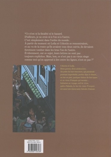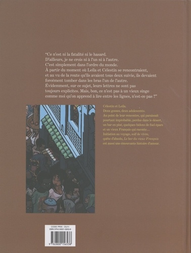 "Ce n'est ni la fatalité ni le hasard. D'ailleurs, je ne crois ni à l'un ni à l'autre. C'est simplement dans l'ordre du monde. A partir du moment où Leila et Célestin se rencontraient, et au vu de la route qu'ils avaient tous deux suivie, ils devaient forcément tomber dans les bras l'un de l'autre. Evidemment, sur ce sujet, leurs lettres ne sont pas toujours explicites. Mais, bon, ce n'est pas à un vieux singe comme moi qu'on apprend à lire entre les lignes, n'est-ce pas ? " Célestin et Leila. Deux gosses, deux adolescents. Au point de leur rencontre, qui paraissait pourtant improbable, perdus dans le désert, un bar en pisé, quelques bidons de fuel épars et un vieux Français qui raconte... Initiation au voyage, soif de vivre, quête d'absolu, Le bar du vieux Français est aussi une émouvante histoire d'amour.
