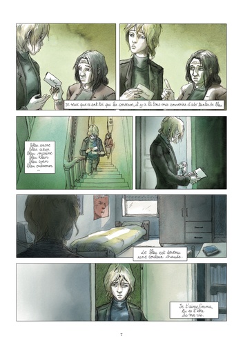 "Mon ange de bleu, Bleu du ciel, Bleu des rivières, Source de vie…". La vie de Clémentine bascule le jour où elle rencontre Emma, une jeune fille aux cheveux bleus, qui lui fait découvrir toutes les facettes du désir. Elle lui permettra d’affronter enfin le regard des autres. Un récit tendre et sensible.