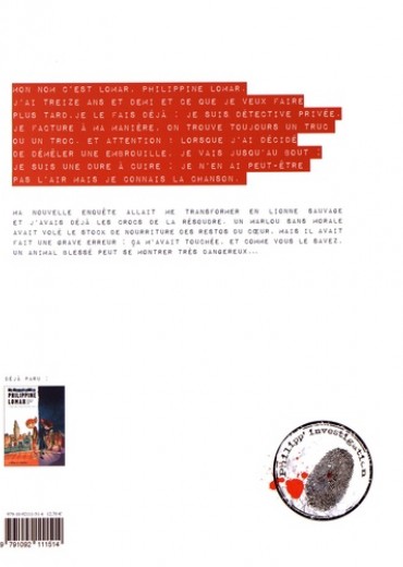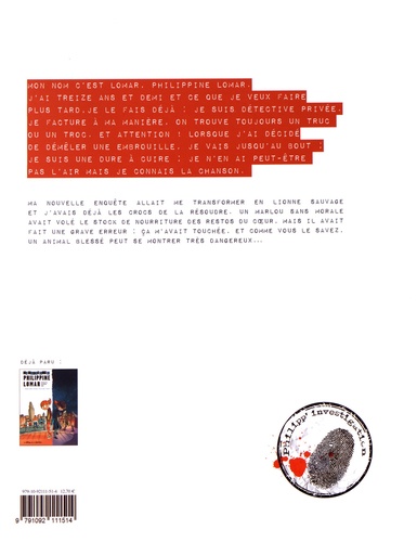 Mon nom c'est Lomar, Philippine Lomar. J'ai treize ans et demi et ce que je veux faire plus tard, je le fais déjà : je suis détective privée. Je facture à ma manière, on trouve toujours un truc ou un troc. Et attention ! Lorsque j'ai décidé de démêler une embrouille, je vais jusqu'au bout ; je suis une dure à cuire ; je n'en ai peut-être pas l'air mais je connais la chanson. Ma nouvelle enquête allait me transformer en lionne sauvage et j'avais déjà les crocs de la résoudre. Un marlou sans morale avait volé le stock de nourriture des Restos du coeur. Mais il avait fait une grave erreur : ça m'avait touchée, et comme vous le savez, un animal blessé peut se montrer très dangereux...