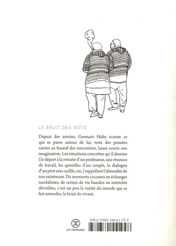 Amateurs de Fabcaro, attention ! Germain Huby est un artiste attentif aux autres. Il cherche à travers les mots à comprendre notre monde, le bruit du vivant. Depuis des années, il écoute ce qui se passe autour de lui, note des pensées et des bouts de dialogues captés au hasard des lieux où il se trouve. A travers des situations très concrètes, qu'il condense à chaque fois en une seule image (le départ à la retraite d'un professeur, une réunion de travail, la promenade d'un chien, l'intimité d'un couple, le dialogue d'un père avec sa fille), c'est à l'absurdité de la condition humaine qu'il nous confronte. De situations cocasses en dialogues surréalistes, de scènes de vie banales en intimités dévoilées, c'est un peu notre vie à tous qu'il nous offre en sourire.