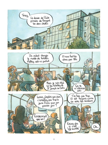 Flora, architecte fraîchement diplômée, démarre sa carrière dans un prestigieux cabinet auprès du grand maître El Rodrigo, capricieux et talentueux. Ce dernier ne va pas tarder à lui offrir sa chance en lui confiant la responsabilité d'un chantier important. Fabien Grolleau (Tanger sous la pluie, Audubon, Darwin) s'est inspiré de ses propres études d'architecte (il est lui-même diplômé d'Etat) et a concocté avec Clément Fabre (Carole), un véritable feelgood-book qui vous permettra de comprendre tous les tenants et aboutissants d'un chantier, avec de savoureux portraits de ses différents intervenants, du client stressé et exigeant à l'électricien stressé , en passant par le maçon bougon, le couvreur un peu perché, ou le patron charismatique. Dargaud a décidé de rééditer ce titre, paru chez Marabulles en 2018, agrémenté de 10 planches inédites et d'une nouvelle couverture.