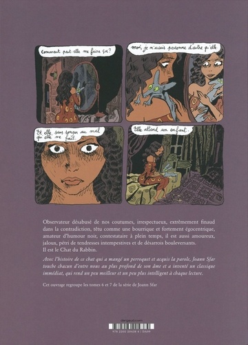 Observateur désabusé de nos coutumes, irrespectueux, extrêmement finaud dans la contradiction, têtu comme une bourrique et fortement égocentrique, amateur d'humour noir, contestataire à plein temps, il est aussi amoureux, jaloux, pétri de tendresses intempestives et de désarrois bouleversants. Il est le Chat du Rabbin. Cet ouvrage regroupe les tomes 6 et 7 de la série de Joann Sfar.