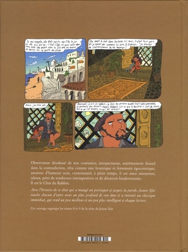 Observateur désabusé de nos coutumes, irrespectueux, extrêmement finaud dans la contradiction, têtu comme une bourrique et fortement égocentrique, amateur d'humour noir, contestataire à plein temps, il est aussi amoureux, jaloux, pétri de tendresses intempestives et de désarrois bouleversants. Il est le Chat du Rabbin. Cet ouvrage regroupe les tomes 8 et 9 de la série de Joann Sfar.