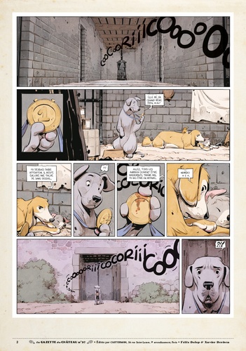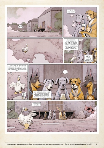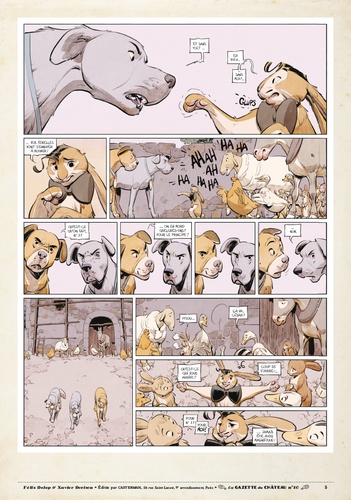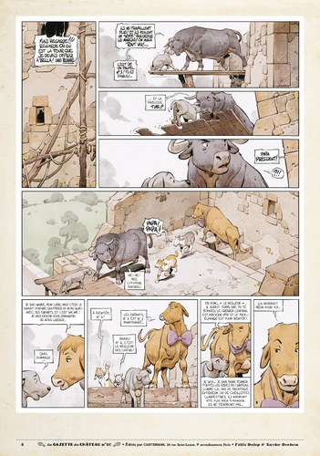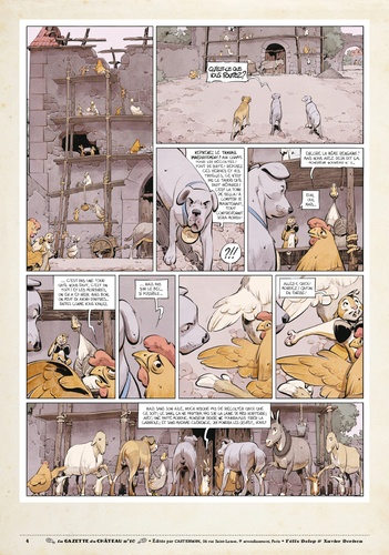 Tandis que Miss B est emprisonnée au donjon du Château, la grève est déclarée. Les animaux ont cessé le travail, mais ils vont plus que jamais devoir rester unis... Mordre ou ne pas mordre ? Un choix cornélien pour les molosses de Silvio, sidérés par la détermination des animaux qui ont cessé le travail. Unis derrière le lapin César qui a pris la tête du mouvement des Marguerites, les animaux sont en lutte. Mais il faut aussi lutter contre la faim qui tenaille les estomacs... et aussi contre la corruption du perfide Silvio, bien décidé à organiser le troc-échange dont il a besoin pour continuer à régner... quitte pour cela à donner quelques gages à Miss B et ses amis. Cette nouvelle Gazette conclut l'avant-dernier tome du Château des animaux !