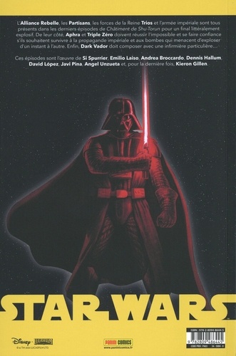 L'Alliance Rebelle, les Partisans, les forces de la Reine Trios et l'armée impériale sont tous présents dans les derniers épisodes de Châtiment de Shu-Torun pour un final littéralement explosif. De leur côté, Aphra et Triple Zéro doivent réussir l'impossible et se faire confiance s'ils souhaitent survivre à la propagande imperiale et aux bombes qui menacent d'exploser d'un instant à l'autre. Enfin, Dark Vador doit composer avec une infirmière particulière... Ces épisodes sont l'oeuvre de Si Spurrier, Emilio Laiso, Andrea Broccardo, Dennis Hallum, David López, Javi Pina, Angel Unzueta et, pour la dernière fois, Kieron Gillen.