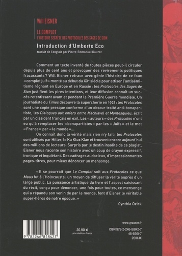 Qui d'autre que le légendaire dessinateur Will Eisner pour retracer l'histoire de ce "complot juif" inventé de toutes pièces au début du XXème siècle pour attiser l'antisémitisme en Europe ? Les Protocoles des Sages de Sion justifient les pires passions et leur diffusion connaît un succès retentissant avant et pendant la première Guerre mondiale. Un journaliste britannique du Times révèle la supercherie en 1921 : les Protocoles sont un plagia d'un obscur traité anti-bonapartiste écrit par un dissident français en exil. Les "auteurs" des Protocoles n'ont eu qu'à remplacer " bonapartistes " par " Juifs " et le mot "France" par "le monde" ... On connaît donc la vérité mais rien n'y fait : les Protocoles sont utilisés par Hitler, le Ku Klux Klan et trouvent encore aujourd'hui de nombreux lecteurs dans les pays arabes et chez les activistes d'extrême droite. Intrigué et choqué par le destin de ce faux grossier, Eisner nous raconte son histoire avec un coup de crayon unique, drôle et noir, ironique et inquiétant ; on est pris par le charme de la bande dessinée sans jamais oublier ce que l'auteur combat : un grand mensonge qui sert la haine et l'antisémitisme.