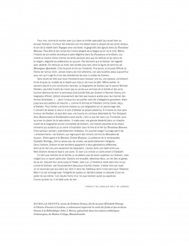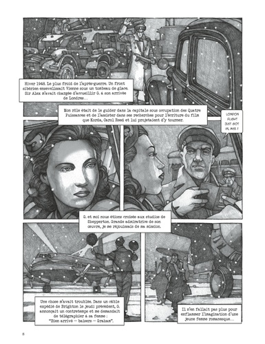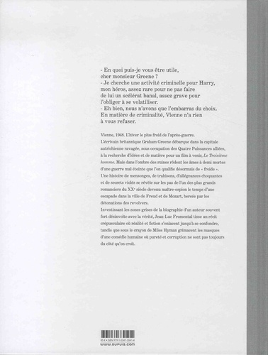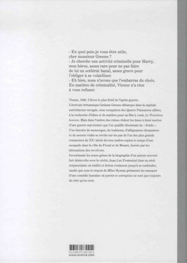 Vienne, 1948. L'hiver le plus froid de l'après-guerre. L'écrivain britannique Graham Greene débarque dans la capitale autrichienne ravagée, sous occupation des Quatre Puissances alliées, à la recherche d'idées et de matière pour un film à venir, Le Troisième homme. Mais dans l'ombre des ruines rôdent les âmes à demi mortes d'une guerre mal éteinte que l'on qualifie désormais de "froide". Une histoire de mensonges, de trahisons, d'allégeances choquantes et de secrets violés se révèle sur les pas de l'un des plus grands romanciers du XXe siècle devenu mitre-espion le temps d'une escapade dans la ville de Freud et de Mozart, bercée par les détonations des revolvers. Investissant les zones grises de la biographie d'un auteur souvent fort désinvolte avec la vérité, Jean-Luc Fromental tisse un récit crépusculaire oh réalité et fiction s'enlacent jusqu'à se confondre, tandis que sous le crayon de Miles Hyman grimacent les masques d'une comédie humaine où pureté et corruption ne sont pas toujours du coté qu'on croit.