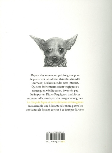 Un monotype ? Le monotype est un procédé d'impression non gravé qui produit un tirage unique. Il s'agit de peindre à l'encre typographique, ou à la peinture à l'huile, sur un support non poreux (comme du verre, du zinc, du cuivre ou du plexiglas). La plaque peinte est ensuite passée sous presse avec un papier qui reçoit l'épreuve. Cette technique ne permet en général l'impression que d'une seule feuille, d'où son nom. Parfois un deuxième tirage, beaucoup plus pâle, est produit : il prend alors le nom de fantôme. Depuis des années, un peintre glane pour le plaisir des faits divers absurdes dans des journaux, des livres et des sites internet. Que ces événements soient tragiques ou ubuesques, véridiques ou inventés, peu lui importe : Didier Paquignon traduit ces moments d'absurde par des images incongrues. Le coup du lapin, et autres histoires extravagantes en rassemble une hilarante sélection, parmi les centaines de dessins conçus à ce jour par l'artiste.
