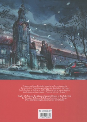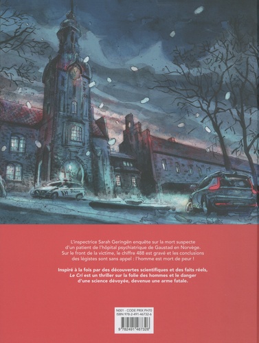 L'inspectrice Sarah Geringën enquête sur la mort suspecte d'un patient d'un hôpital psychiatrique. La victime a gravé sur le front le chiffre 488 et les conclusions des légistes sont sans appel : l'homme est mort de peur ! Inspiré par des découvertes scientifiques et des faits réels, Le Cri est un thriller sur la folie des hommes et le danger d'une science dévoyée, transformée en arme fatale. Il s'agit du premier livre adapté de la trilogie de Nicolas Beuglet dont Sarah Geringën est l'héroïne : Le cri (2016), Complot (2018), L'Ile du Diable (2019) Qui est Sarah Geringën ? Sarah Geringën est une ancienne membre des forces spéciales, désormais inspectrice norvégienne d'Oslo. Bientôt la quarantaine, rousse, athlétique, et réputée pour son intimidante froideur dans le cadre professionnel, c'est une femme qui ne serre jamais la main pour ne pas créer de liens avec ceux qu'elle interroge. Inspiré par des découvertes scientifiques et des événements réels, Le Cri renvoie à nos peurs les plus intérieures. Un thriller sur la folie des hommes et le danger d'une science dévoyée, transformée en arme fatale. Ce récit tient formidablement en haleine le lecteur, qui l'interpelle aussi sur de grands sujets existentiels : l'origine et l'avenir de l'humanité, la science, la folie des hommes qui jouent aux apprentis sorciers...