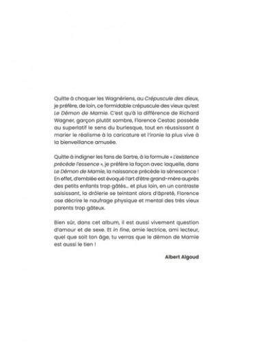 "La vieillesse est si longue qu'il ne faut pas commencer trop tôt" , disait Benoîte Groult. Et c'est bien ce que se dit l'héroïne de Florence Cestac, que nous avons le plaisir de suivre depuis "Le Démon de midi". Noémie attaque avec l'allant qui la caractérise cette partie de la vie un peu obscure, un peu invisibilisée, qu'est l'arrivée du grand âge. Avec son incorrigible façon de voir la vie en rose, le double de papier de Florence Cestac dresse un inventaire à la Prévert des petites joies et des gros tracas liés à cette période de la vie. Les petits-enfants qu'il faut garder, avec leurs lots de bons moments et de crises de nerfs ; les parents qui perdent la boule en Ehpad ; les vicissitudes de la vie de couple à ces âges-là ou le célibat ; le corps qui lâche par petits morceaux ; les sites de rencontres pour seniors et la question taboue de la sexualité ; les deuils successifs de proches ; le choix de pouvoir mourir dignement...