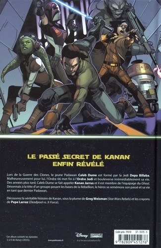 Lors de la Guerre des Clones, le jeune Padawan Caleb Dume est formé par la Jedi Depa Billaba. Malheureusement pour lui, l'Ordre 66 met fin à l'Ordre Jedi et bouleverse irrémédiablement sa vie. Des années plus tard, Caleb Dume se fait appeler Kanan Jarrus et il est membre de l'équipage du Ghost. Désormais à la tête d'un groupe posant les bases de la Rébellion ; le héros se remémore son passé et sa vie en tant que dernier Padawan. Découvrez la véritable histoire de Kanan, sous la plume de Greg Weisman (Star Wars Rebels) et les crayons de Pepe Larraz (Deadpool vs. X-Force).