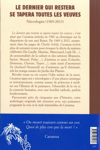 Le dernier qui restera se tapera toutes les veuves : c'est ainsi que Cavanna intitula en 1983 sa chronique sur la disparition de son ami Reiser. De 1969 à 2013, notamment dans les pages de Charlie hebdo, Cavanna écrivit plus de soixante textes pour évoquer le décès de maintes célébrités (De Gaulle, Mesrine, Mitterrand, Lady Di...), de personnalités de la culture et des sciences (Brassens, Sartre, Monod, Polac...), d'artistes et amis (Coluche, Doisneau, Choron, Topor...), mais aussi d'anonymes (le clochard Neuneuil) ou d'animaux qu'il chérissait, tels les orangs-outans du jardin des Plantes. Révolté toute sa vie contre l'idée même de la mort, Cavanna signe ses "nécrologies" d'une plume caustique et irrévérencieuse, comme autant de prétextes à méditer sur l'illusion de la puissance, l'absurdité de la vie et la connerie humaine, avec une lucidité radicale, parfois bouleversante. Parcourant près de cinquante ans d'histoire, cette anthologie originale fait résonner avec une puissance poignante la voix et le style inimitables de Cavanna.
