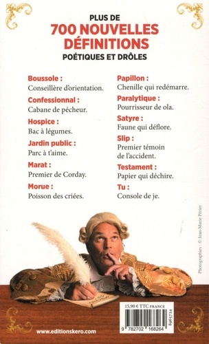 Plus de 700 NOUVELLES DEFINITIONS poétiques et drôles. Boussole : Conseillère d'orientation. Papillon : Chenille qui redémarre. Confessionnal : Cabane de pécheur. Paralytique : Pourrisseur de ola. Hospice : Bac à légume. Satyre : Faune qui déflore. Jardin public : Parc à t'aime. Slip : Premier témoin de l'accident. Marat : Premier de Corday Testament : Papier qui déchire. Morue : Poisson des criées. Tu : Console de je.