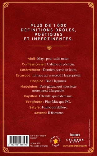 PLUS DE 1000 DEFINITIONS DRÔLES, POETIQUES ET IMPERTINENTES. Aïoli : Mayo pour sado-maso. Confessionnal : Cabane de pécheur. Enterrement : Dernière sortie en boîte. Escargot : Limace qui a accédé à la propriété. Hospice : Bac à légumes. Madeleine : Petit gâteau qui nous jette notre passé à la gueule. Papillon : Chenille qui redémarre. Proxénète : Plus Mac que PC. Satyre : Faune qui déflore. Travesti : Il flottante.
