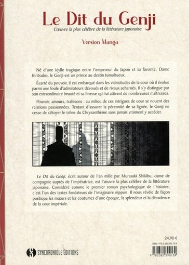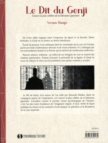 Né d'une idylle tragique entre l'empereur du Japon et sa favorite, Dame Kiritsubo, le Genji est un prince au destin tumultueux. Ecarté du pouvoir, il est embarqué dans les vicissitudes de la cour où il évolue parmi une foule d'admirateurs dévoués et de rivaux acharnés. Il s'y distingue par son extraordinaire beauté et sa finesse qui lui attirent de nombreuses maîtresses. Pouvoir, amours, trahisons : au milieu de ces intrigues de cour se nouent des relations passionnées. Tentant d'assurer la pérennité de sa lignée, le Genji ne cesse de côtoyer le trône du Chrysanthème sans jamais vraiment y accéder. Le Dit du Genji, écrit autour de l'an mille par Murasaki Shikibu, dame de compagnie auprès de l'impératrice, est l'oeuvre la plus célèbre de la littérature japonaise. Considéré comme le premier roman psychologique de l'histoire, c'est l'un des textes fondateurs de l'imaginaire nippon. Il nous révèle de façon poétique les moeurs et les coutumes d'une époque, la splendeur et la décadence de la cour impériale.