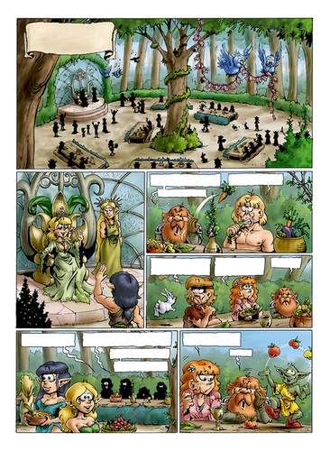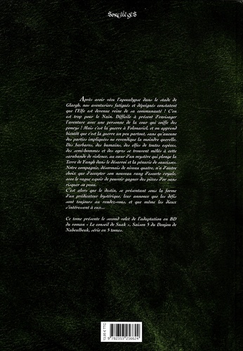 Après avoir vécu l'apocalypse dans le stade de Glargh, nos aventuriers fatigués et dépeignés constatent que l'Elfe est devenue reine de sa communauté ! C'en est trop pour le Nain. Difficile à présent d'envisager l'aventure avec une personne de la cour qui coiffe des poneys ! Mais c'est la guerre à Folonariel, et on apprend bientôt que c'est la guerre un peu partout, sans qu'aucune des parties impliquées ne revendique la moindre querelle. Des barbares, des humains, des elfes de toutes espèces, des semi-hommes et des ogres se trouvent mêlés à cette sarabande de violence, au coeur d'un mystère qui plonge la Terre de Fangh dans le désarroi et la pénurie de saucisses. Notre compagnie, désormais de niveau quatre, n'a d'autre choix que d'accepter son nouveau rang d'escorte royale, avec le vague espoir de pouvoir gagner de pièces d'or sans risquer sa peau. C'est alors que le destin, se présentant sous la forme d'un prédicateur hystérique, leur annonce que les défis sont toujours au rendez-vous, et que même les dieux s'intéressent à eux.. Ce tome présente le second volet de l'adaptation en BD du roman "Le conseil de Suak", Saison 5 du Donjon de Naheulbeuk, série en 5 tomes.