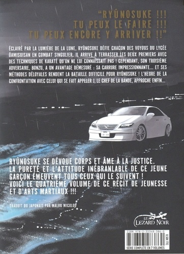 "Ryûnosuke !!! Tu peux le faire !!! Tu peux encore y arriver !! " Eclairé par la lumière de la lune, Ryûnosuke défie chacun des voyous du lycée Ôamisuisan en combat singulier. Il arrive à terrasser les deux premiers avec des techniques de karaté qu'on ne lui connaissait pas ! Cependant, son troisième adversaire, Bonzu, a un avantage démesuré : sa carrure impressionnante... et ses méthodes déloyales rendent la bataille difficile pour Ryûnosuke ! L'heure de la confrontation avec celui qui se fait appeler J, le chef de la bande, approche enfin... Ryûnosuke se dévoue corps et âme à la justice. La pureté et l'attitude inébranlable de ce jeune garçon émeuvent tous ceux qui le suivent ! Voici le quatrième volume de ce récit de jeunesse et d'arts martiaux !!!