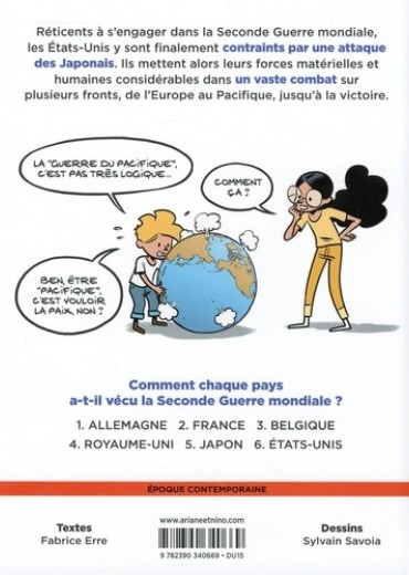 La Seconde Guerre mondiale fut un conflit complexe, que chaque belligérant vécut avec ses propres particularités... Grâce au principe " Un album, un pays ", Ariane et Nino vont tout vous expliquer de cette guerre meurtrière avec une simplicité désarmante. Avec 1939-1945, Les Etats-Unis débarquent, nos deux petits enseignants vont précisément s'attacher au rôle crucial des Etats-Unis. Pourquoi entrèrent-ils en guerre ? Quelles furent les petites histoires dans la grande ? Comment les Américains permirent-ils de vaincre l'Allemagne nazie ? S'inviter dans l'Histoire pour en raconter les grands moments incontournables, voilà le parti pris d'Ariane et Nino. En partant toujours du réel d'aujourd'hui, ces livres permettent aux enfants de se sentir concernés par l'Histoire. Le scénariste Fabrice Erre est docteur en Histoire et professeur d'histoire-géographie, ces livres sont donc de véritables outils pédagogiques en lien avec le programme scolaire.