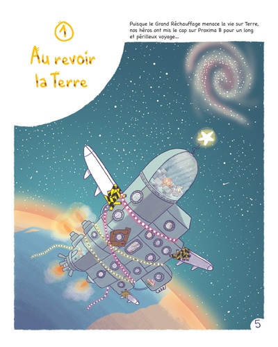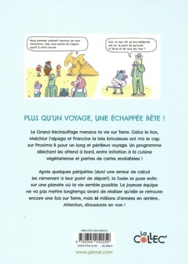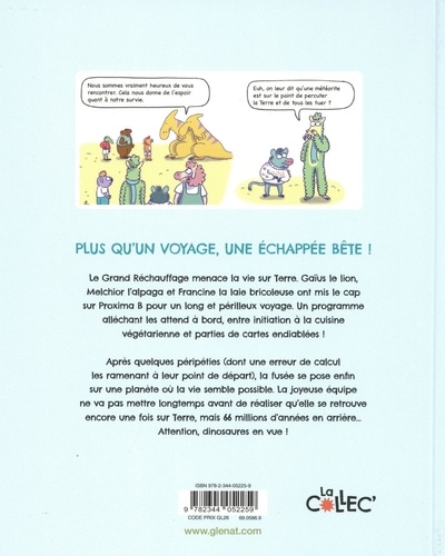 Plus qu'un voyage, c'est uneéchappée bête ! Le Grand Réchauffage menace la vie sur Terre et nos héros ont mis le cap sur Proxima B pour un long et périlleux voyage... Un programme alléchant les attend à bord, entre initiation à la cuisine végétarienne et parties de cartes endiablées ! Mais après quelques péripéties (dont une erreur de calcul les ramenant à leur point de départ), la fusée se pose enfin sur une planète où la vie semble possible. La joyeuse équipe ne va pas mettre longtemps avant de réaliser qu'elle se retrouve encore une fois sur Terre, mais 66 millions d'années en arrière... Attention, dinosaures en vue !