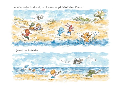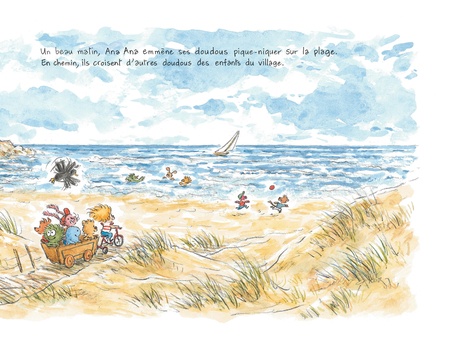 Ana Ana et les doudous jouent au ballon sur la plage. Baleineau reste en retrait, ce qui inquiète ses copains... Que lui arrive-t-il ? pourquoi reste-t-il seul ? Est-il triste ? Baleineau a beau expliquer qu'il n'est pas triste mais heureux de contempler l'océan, personne n'en croit rien, et la joyeuse troupe se regroupe autour de lui pour lui remonter le moral. C'est sans compter sur ce coquin de Touffe de poils qui dévore le pique-nique tout seul. Comment Ana Ana et les doudous vont-ils faire pour pique-niquer à présent ?