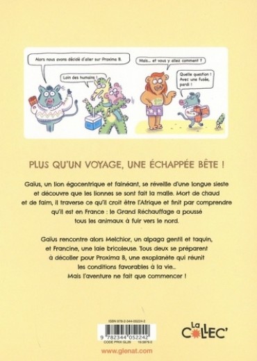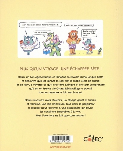 Des animaux prêts à tout pour fuir le Grand Réchauffage : plus qu'un voyage, c'est une échappée bête ! Gaïus, un lion égocentrique et fainéant, se réveille d'une longue sieste. Les lionnes se sont fait la malle. Mort de chaud et de faim, il traverse ce qu'il croit être l'Afrique et finit par comprendre qu'il est en France : le Grand Réchauffage a poussé tous les animaux à fuir vers le nord. Il rencontre Melchior, un alpaga gentil et taquin, et Francine, une laie bricoleuse, prêts à décoller pour Proxima B. C'est sa chance ! Soucieux de son futur garde-manger, Gaïus se lance dans un monologue sur l'importance de sauver toutes les espèces. Melchior s'illumine : mais oui, le fauve a raison, il faut embarquer un couple de chaque espèce... La tâche va se révéler plus difficile que prévu car les hyènes sont déterminées à se venger de la suprématie des lions !