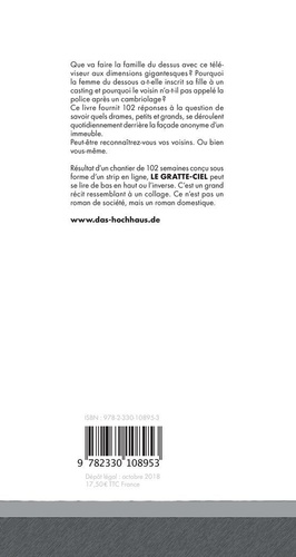 Que va faire la famille du dessus avec ce téléviseur aux dimensions gigantesques ? Pourquoi la femme du dessous a-t-elle inscrit sa fille à un casting et pourquoi le voisin n'a-t-il pas appelé la police après un cambriolage ? Ce livre fournit 102 réponses à la question de savoir quels drames, petits et grands, se déroulent quotidiennement derrière la façade anonyme d'un immeuble. Peut-être reconnaîtrez-vous vos voisins. Ou bien vous-même. Résultat d'un chantier de 102 semaines conçu sous forme d'un strip en ligne, Le Gratte-ciel peut se lire de bas en haut ou l'inverse. C'est un grand récit ressemblant à un collage. Ce n'est pas un roman de société, mais un roman domestique.