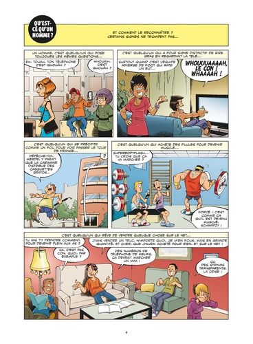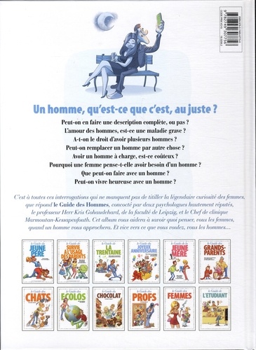 L'homme est un spécimen étrange. Il a pour signe distinctif de : rire gras et parler fort devant la télé (surtout lors des matchs de foot), accoster les femmes dans la rue de façon lourde et grossière, ne pas se soucier outre mesure de son hygiène corporelle ou mettre tout en œuvre pour en faire le moins possible. Autant le dire clairement : pour la femme, l'homme reste un mystère. Mais alors pourquoi ne peuvent-elles pas s'en passer ?Rassurez-vous mesdames, les Guides en BD sont là pour répondre à toutes vos questions ! Dans une succession de gags en une planche, le Guide de l'homme expliqué à la femme vous présente avec humour les différents types d'hommes qui existent, leurs habitudes, leurs qualités, leurs défauts... Et il vous permettra surtout de savoir si ces messieurs sont vraiment si indispensables que ça !