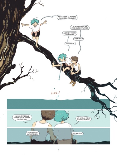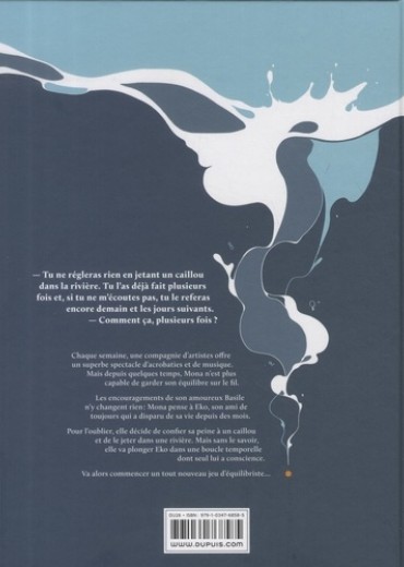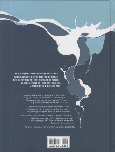 - Tu ne régleras rien en jetant un caillou dans la rivière. Tu l'as déjà fait plusieurs fois et, si tu ne m'écoutes pas, tu le referas encore demain et les jours suivants. - Comment ça, plusieurs fois ? Chaque semaine, une compagnie d'artistes offre un superbe spectacle d'acrobaties et de musique. Mais depuis quelques temps, Mona n'est plus capable de garder son équilibre sur le fil. Les encouragements de son amoureux Basile n'y changent rien : Mona pense à Eko, son ami de toujours qui a disparu de sa vie depuis des mois. Pour l'oublier, elle décide de confier sa peine à un caillou et de le jeter dans une rivière. Mais sans le savoir, elle va plonger Eko dans une boucle temporelle dont seul lui a conscience. Va alors commencer un tout nouveau jeu d'équilibriste...
