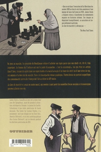 Un jour au marché, le grossiste de Mendleman refuse d'acheter ses tapis parce que son stock est, dit-il, trop important. La femme de l'artisan est sur le point d'accoucher : c'est la catastrophe. Lui qui était un artiste dans l'âme, tentant de saisir dans ses tapis brodés à la main la magie d'un lever de soleil ou d'une scène de rue, est soumis à la dure loi du marché. Dans ce remarquable roman graphique, Sturm dresse un portrait magnifique des communautés juives de l'Europe de l'Est au début du XXe siècle. Le Jour du marché est aussi un conte moral, qui montre à quel point de nouvelles forces sociales et économiques peuvent affecter une vie.