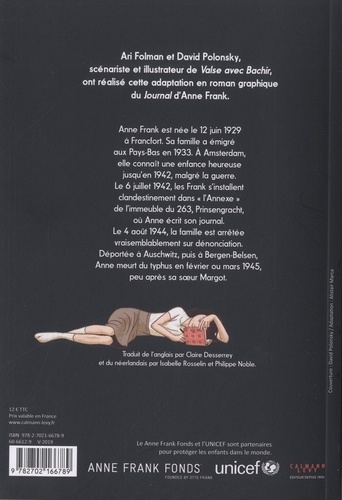 Ari Folman et David Polonsky, scénariste et illustrateur de Valse avec Bachir, ont réalisé cette adaptation en roman graphique du Journal d'Anne Frank. Anne Frank est née le 12 juin 1929 à Francfort. Sa famille a émigré aux Pays-Bas en 1933. A Amsterdam, elle connaît une enfance heureuse jusqu'en 1942, malgré la guerre. Le 6 juillet 1942, les Frank s'installent clandestinement dans "l'Annexe" de l'immeuble du 263, Prinsengracht, où Anne écrit son journal. Le 4 août 1944, la famille est arrêtée vraisemblablement sur dénonciation. Déportée à Auschwitz, puis à Bergen-Belsen, Anne meurt du typhus en février ou mars 1945, peu après sa soeur Margot.