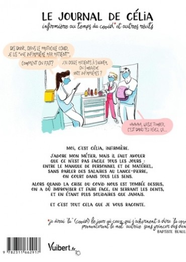 Un témoignage en dessins, fort et touchant, sur la crise du COVID et le métier d'infirmière Célia est une jeune infirmière de 27 ans qui a vécu la première vague de la pandémie du COVID : elle raconte dans cette BD ce qui l'a marquée, émue, mise en colère aussi : partout en Europe et dans le monde, les professions soignantes sont malmenées, pressurisées, épuisées par cet épisode sans précédent qui se prolonge depuis plus d'un an. Ce Journal de Célia, infirmière au temps du COVID et autres récits est un témoignage fort de ce qu'ont vécu les équipes pendant la crise sanitaire, au coeur de l'hôpital, en France et ailleurs. Il donne la parole à une infirmière, profession qu'on entend peu sur les plateaux de TV et de radio mais pourtant en première ligne des soins. C'est également le journal d'une jeune femme d'aujourd'hui, ancrée dans son époque, remplie de doutes mais aussi d'espoirs ! Les histoires contées par Célia et illustrées par Mademoiselle Caroline montrent l'inquiétude, la fatigue, l'abattement certains jours, mais aussi la solidarité, le professionnalisme, les moments ironiques et drôles parfois. Et au-delà d'un journal de bord sur le COVID, c'est un témoignage sur le métier d'infirmière qui parlera à tous.