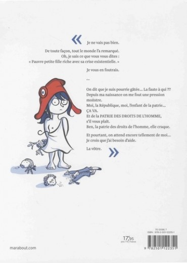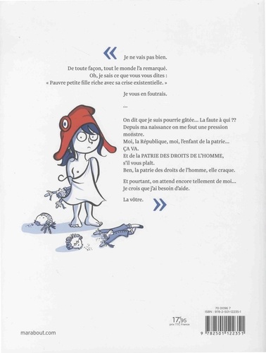 "Je ne vais pas bien. De toute façon, tout le monde l'a remarqué. Oh, je sais ce que vous vous dites : Pauvre petite fille riche avec sa crise existentielle." Je vous en foutrais. On dit que je suis pourrie gâtée... La faute à qui ?? Depuis ma naissance on me fout une pression monstre. Moi, la République, moi, l'enfant de la patrie... CA VA. Et de la PATRIE DES DROITS DE L'HOMME, s'il vous plaît. Ben, la patrie des droits de l'homme, elle craque. Et pourtant, on attend encore tellement de moi... Je crois que j'ai besoin d'aide. La vôtre.