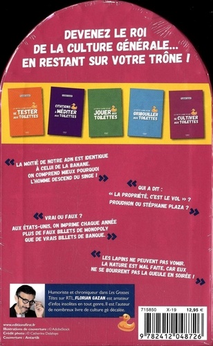 Le kit pour se cultiver... sur le trône ! Voici enfin la crème de la crème... de la bibliothèque pour toilettes ! Vous y trouverez 4 petits livres à dévorer sur le trône, bourrés d'infos de culture générale. Histoire, sciences naturelles, médecine, nouvelles technologies, people... il y en a pour tous les goûts. Avec toujours une chute pour sourire ! Vous allez même vous cultiver, mais sans vous prendre la tête. Testé et approuvé par les auditeurs et les téléspectateurs de Florian Gazan ! Le petit livre pour se cultiver aux toilettes : Le retour - 96 nouvelles infos futiles et utiles pour se cultiver sur le trône ! Le petit livre pour se tester aux toilettes : 96 vrais/faux amusants - Vrai ou faux ? Un escargot se déplace à la vitesse de 360 mètres à l'heure. Vrai. Du coup, pour un escargot, une tortue, c'est Usain Bolt. Le petit livre des citations à méditer aux toilettes : 96 "Qui a dit" et leur chute ! Qui a dit : "L'Empire, c'est la paix" ? Napoléon III ou Dark Vador ? (Napoléon III). Le petit livre pour jouer aux toilettes : 96 sudoku, quiz, mots fléchés... Le petit livre pour gribouiller aux toilettes : de quoi passer le temps en laissant ses pensées s'échapper... sur le papier !