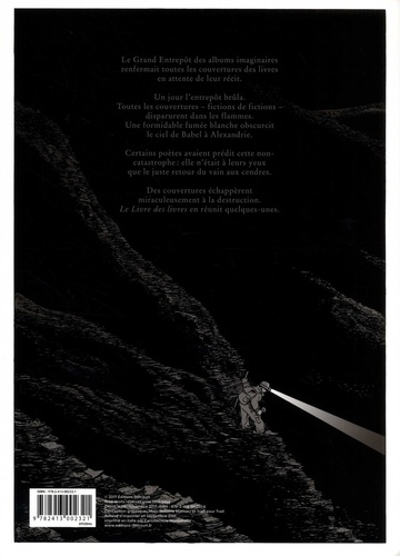 Submergé par son inspiration, Marc-Antoine Mathieu imagine un recueil de couvertures de livres qui n'existent pas, mais dont le titre, le texte de présentation et l'illustration portent en eux le ferment d'univers insolites. Lorsque le Grand Entrepôt Des Albums Imaginaires brûla, toutes les couvertures en attente de leur histoire partirent en fumée, les fictions de fictions disparurent en une fumée blanche qui obscurcit le ciel de Babel à Alexandrie. Quelques-unes échappèrent aux flammes. Comme autant de flacons en quête de leur ivresse, ces promesses de récits furent mises à la page pour devenir un livre, ce livre...