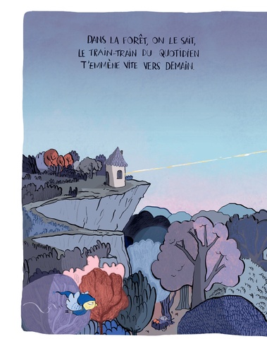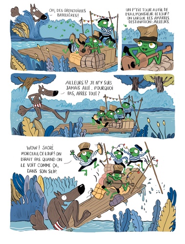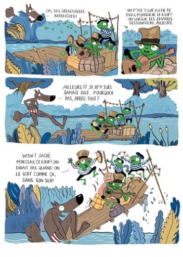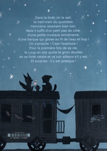 Dans la forêt, on le sait, le train-train du quotidien t'emmène rarement bien loin. Mais il suffit d'un petit pas de côté, d'une petite musique entrainante, d'une barque qui glisse au fil de l'eau et hop ! On s'arrache ! C'est parti pour l'ailleurs ! Pour la première fois de sa vie, le Loup en slip quitte le giron douillet de sa forêt natale et découvre d'autres façons de vivre. Un drôle de train l'arrache à son train-train, il part pour le lointain ! Les pays inconnus, les gens pas comme lui ! C'est l'aventure ! Au marché coloré de la somptueuse vallée des idoles, il découvre d'autres cultures, d'anciennes croyances presque oubliées, des bichonneurs de statues qui toilettent d'anciens dieux dont on a oublié le nom mais qui ont des têtes sympathiques. Il rencontre surtout la plus envoûtante des renardes du désert, qui le guide dans ce grand inconnu, ce vaste champ du "pas comme chez nous" et sur un autre territoire plus périlleux encore : celui des sentiments. Un album pour voyager léger, sans chocottes ni baluchon, et rentrer à jamais changé !