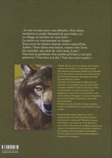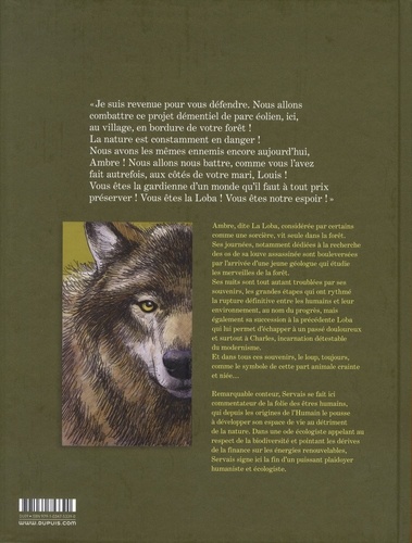 Ambre, dite " La Loba ", et que certains considèrent comme une vieille sorcière, vit seule dans la forêt. Son objectif : retrouver les os de son loup assassiné, qu'elle espère ressusciter grâce à d'antiques secrets... Mais l'arrivée dans sa montagne d'une jeune chercheuse vient troubler l'équilibre de sa vie diurne. Sa vie nocturne, elle, est comme toujours rythmée par ses souvenirs. Ambre se rappelle ainsi comme elle succéda à la précédente " Loba ", échappant à un déséquilibre entre l'Homme et la Nature, incarnée par Charles, son ami d'enfance, détestable chantre du " modernisme "... Elle se rappelle aussi les grandes étapes qui rythmèrent la rupture définitive entre les humains et leur environnement, au nom du " progrès ". Et dans tous ces souvenirs, le loup, toujours, comme le symbole de cette part animal crainte et niée... Toujours plus beau, toujours plus habité : la fin d'un puissant plaidoyer humaniste et écologiste signé Servais.