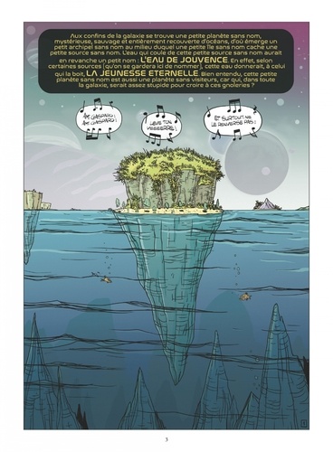 Dans l'espace, tout le monde vous entendra rire... Après un sidérant voyage intersidéral, l'équipage du Kouklamoon se retrouve sur une petite planète sans nom, mystérieuse, sauvage et entièrement recouverte d'océans, d'où émerge un petit archipel sans nom au milieu duquel une petite île sans nom cache une petite source sans nom. L'eau qui coule de cette petite source sans nom aurait en revanche un petit nom : l'eau de jouvence. En effet, selon certaines sources (qu'on se gardera ici de nommer), cette eau donnerait, à celui qui la boit, la jeunesse éternelle ! Bien entendu, cette petite planète sans nom est aussi une planète sans visiteurs, car qui, dans toute la galaxie, serait assez stupide pour croire à ces gnoleries ? Les pirates fétiches de Nicolas Pothier et Frédérik Salsedo partent pour une nouvelle aventure hilarante... aux confins de la galaxie ! Pour l'occasion, c'est Frédérik Salsedo, le dessinateur originel de la série régulière Ratafia (désormais dessinée par Johan Pilet), qui reprend les commandes de ce spin-off. Ratafia Delirium, ou quand l'humour d'Astérix rencontre le monde sans limite de Star Wars !